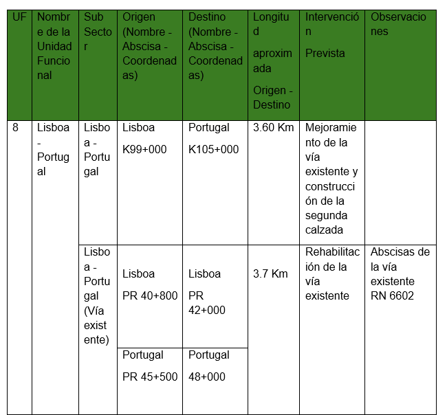 Tabla 6‑3 Unidades Funcionales del Proyecto (Solamente en el renglón correspondiente a la UF8)